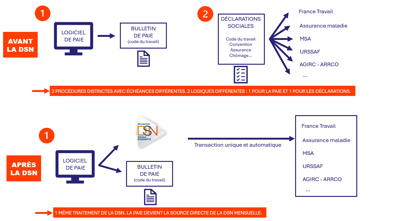 La DSN est un fichier mensuel produit à partir de la paie destiné à communiquer les informations nécessaires à la gestion de la protection sociale des salariés.